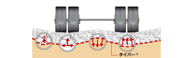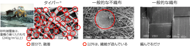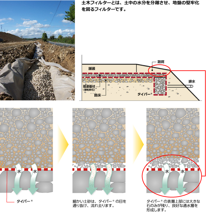 ジオテキスタイルとは、タイパー®を土中に埋設することで、地盤各層の保持・不等沈下の抑制により、地盤の安定を図るものです。