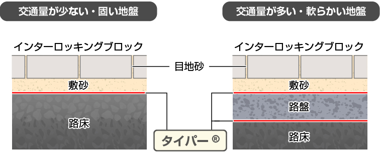交通量が多い・地盤の軟らかい場所では、敷砂と路床の間だけでなく、路盤と路床の間にもタイパー®を敷設することを推奨しています。