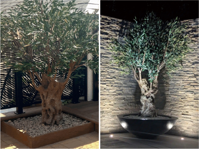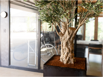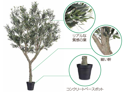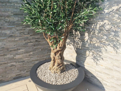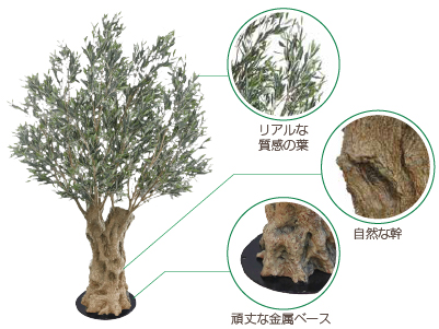 成熟したオリーブの木をイメージ。リアルな葉と、自然のディテールを精密に再現したファイバーグラス製の幹が特徴です。