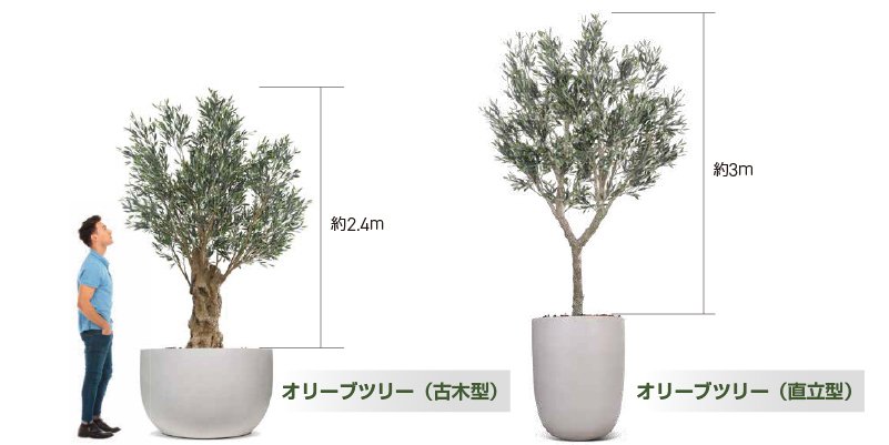 成熟したオリーブの木をイメージ。リアルな葉と、自然のディテールを精密に再現したファイバーグラス製の幹が特徴です。